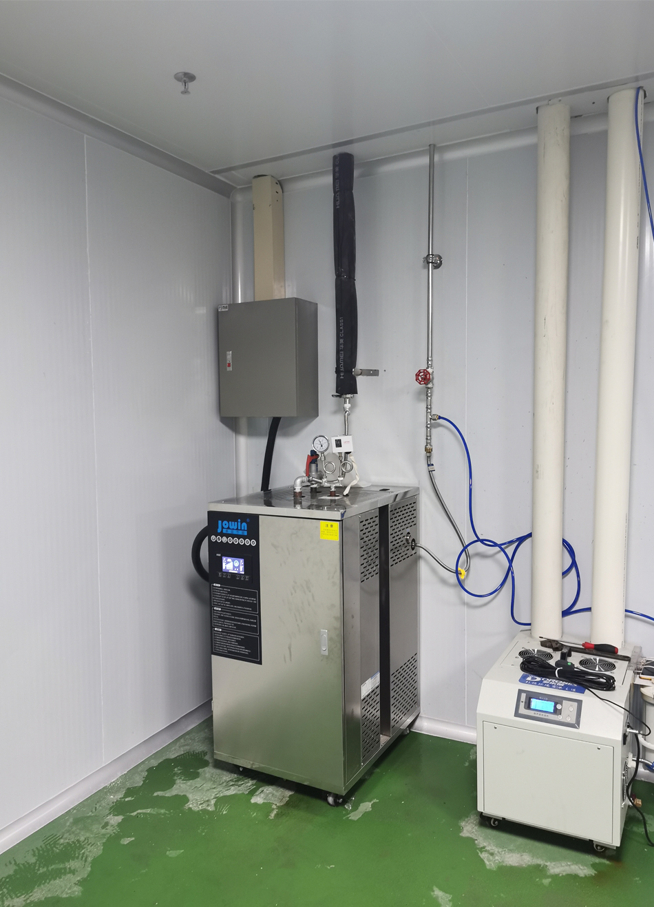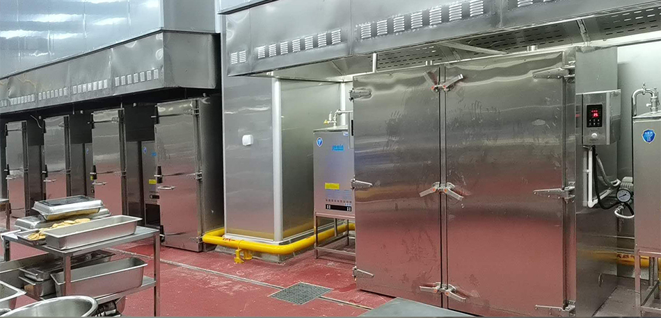 夾層鍋采用中央蒸汽供熱熱水槽真空速冷機采用中央蒸汽供熱選用10余套我司智能蒸箱+蒸汽機組合中央廚房選用我司高溫節能蒸汽機為雙車蒸柜配置蒸汽。凍庫采用我司商用電熱立式蒸汽發生器提供蒸汽,其蒸發量最大可達200kg/h。