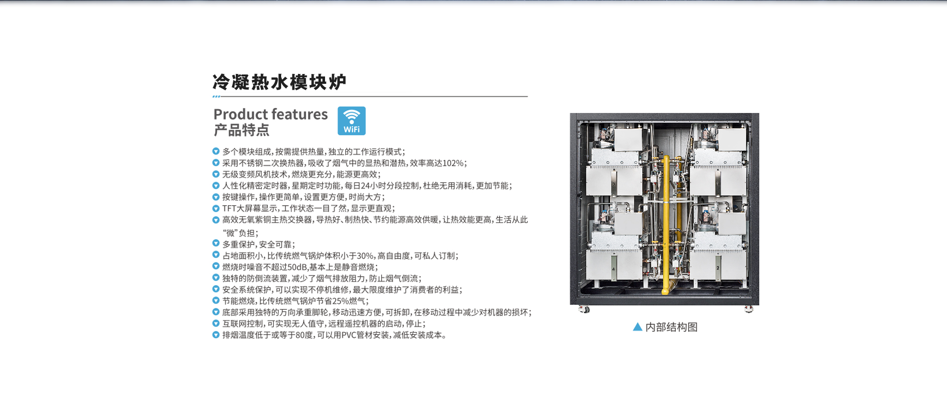 模塊智能控制,分級啟動,比例燃燒技術,中央控溫系統,102%熱效率,變頻控制應用范圍:酒店、工廠、學校、商場、游泳池