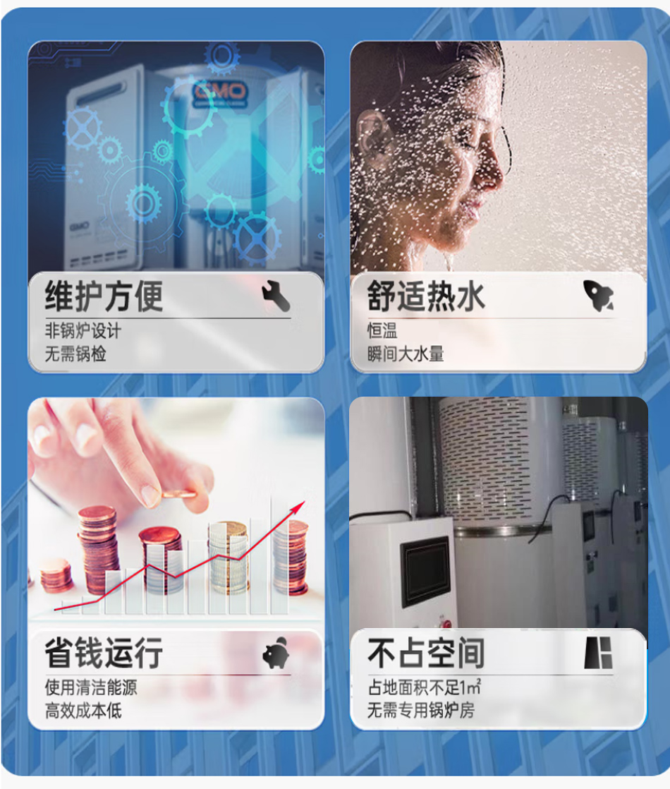 卓益商用系列燃氣容積式熱水爐,整機由燃燒器、脈沖控制器、比例閥、膨脹罐、增壓泵、水膽、風機等要件構成。運用最新燃燒換熱技術設計制造,一鍵操作,智能控制,使用液化石油氣、天然氣等氣體燃料,快持續產生大量熱水。設備自動運行,可單機或多機組合使用,適用于中小型集中熱水項目。