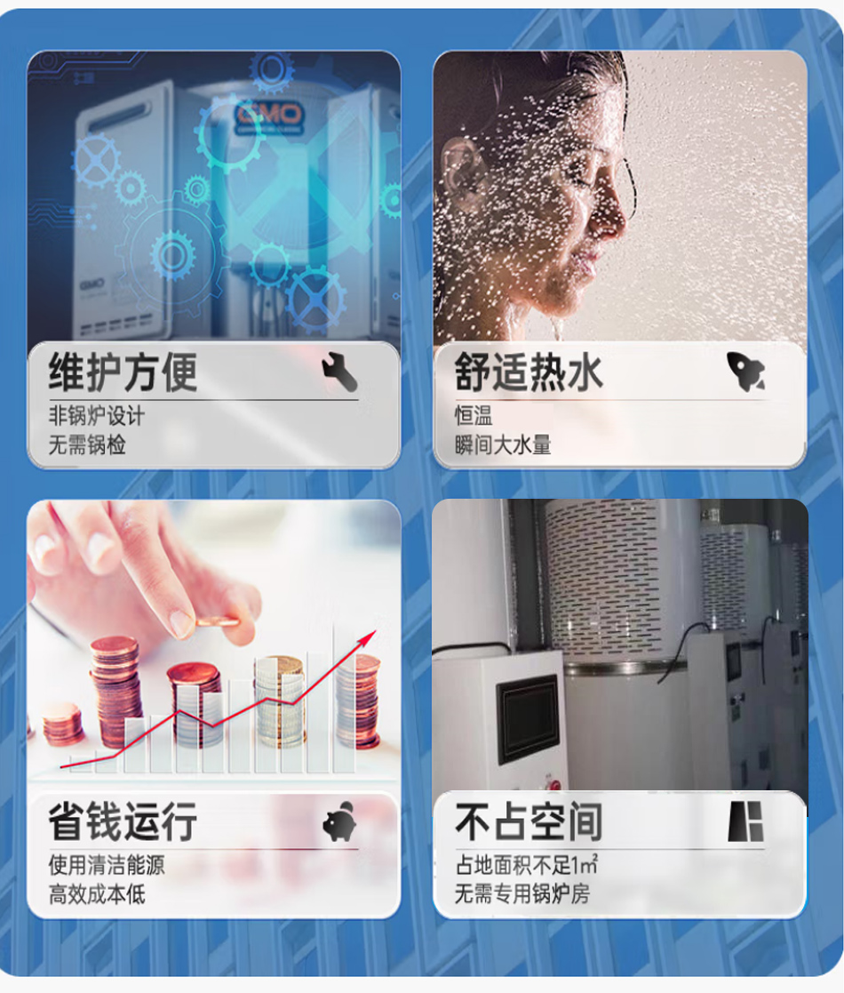卓益商用系列燃?xì)馊莘e式熱水機(jī),整機(jī)由燃燒器、脈沖控制器、比例閥、膨脹罐、增壓泵、水膽、風(fēng)機(jī)等要件構(gòu)成。運(yùn)用最新燃燒換熱技術(shù)設(shè)計(jì)制造,一鍵操作,智能控制,使用液化石油氣、天然氣等氣體燃料,快持續(xù)產(chǎn)生大量熱水。設(shè)備自動運(yùn)行,可單機(jī)或多機(jī)組合使用,適用于中小型集中熱水項(xiàng)目。