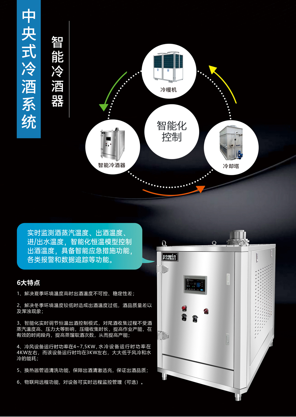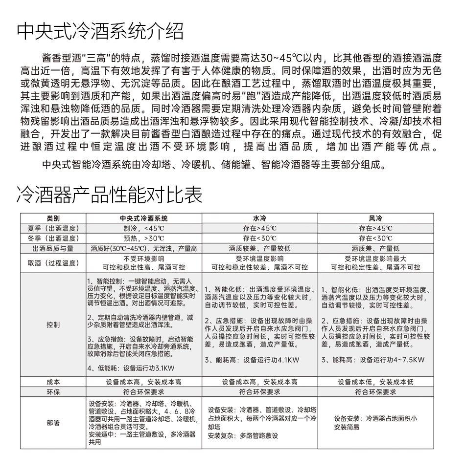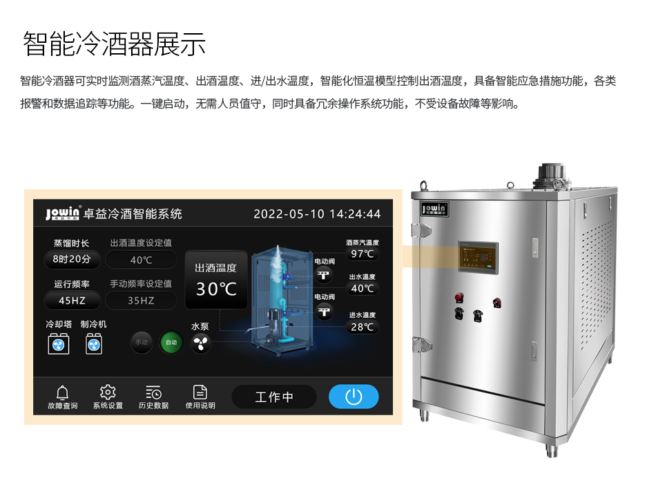 實時監測酒蒸汽溫度、出酒溫度、進/出水溫度,智能化恒溫模型控制 出酒溫度,具備智能應急措施功能,各類報警和數據追蹤等功能,換熱器管道清洗功能,保障出酒清澈透亮,保證出酒品質。