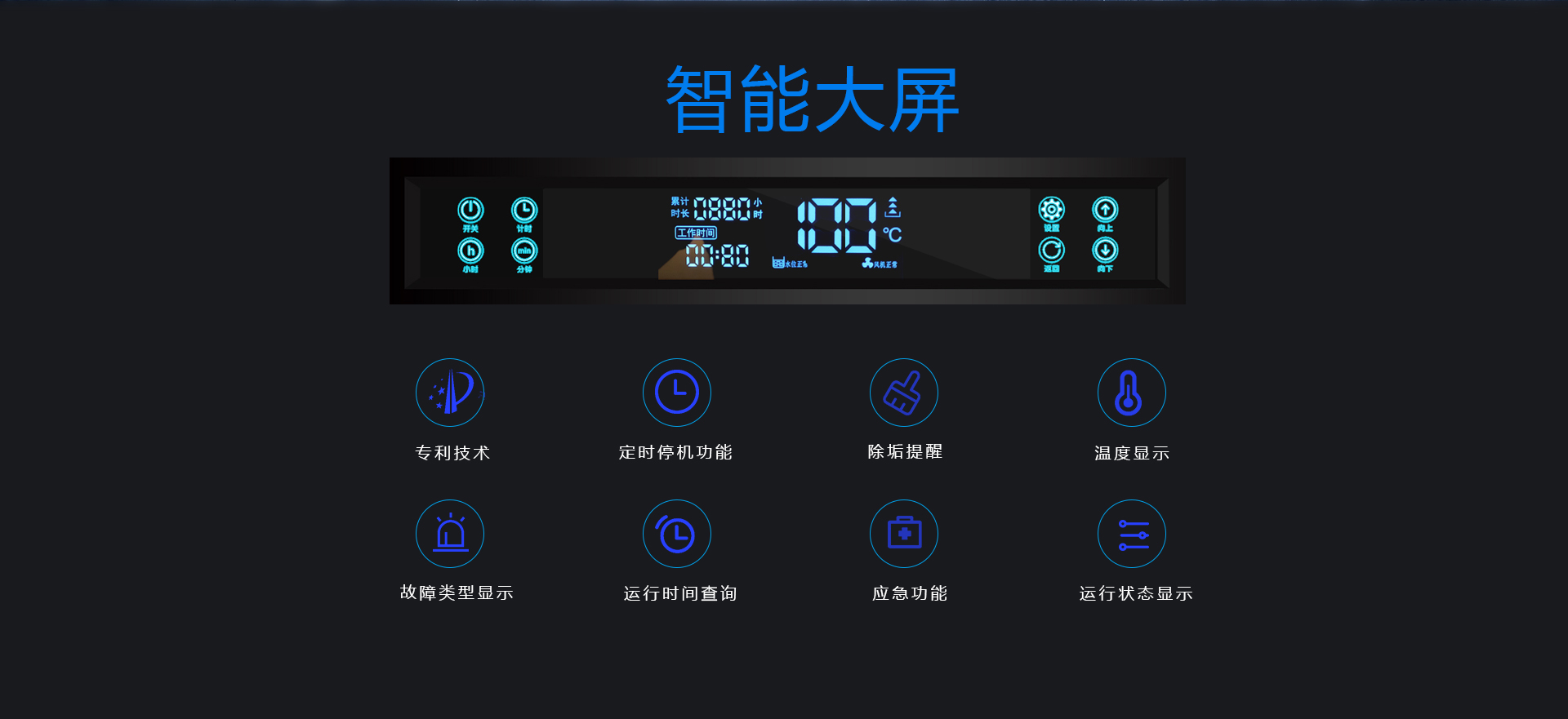 超大顯示屏,多重保護,除垢提醒,溢火保護,整體式爐膛,故障自診,耐壓副水箱,定時關機,低水位保護,304不銹鋼水膽,應用范圍:餐飲食堂,食品加工,洗碗消毒,洗浴水療等。